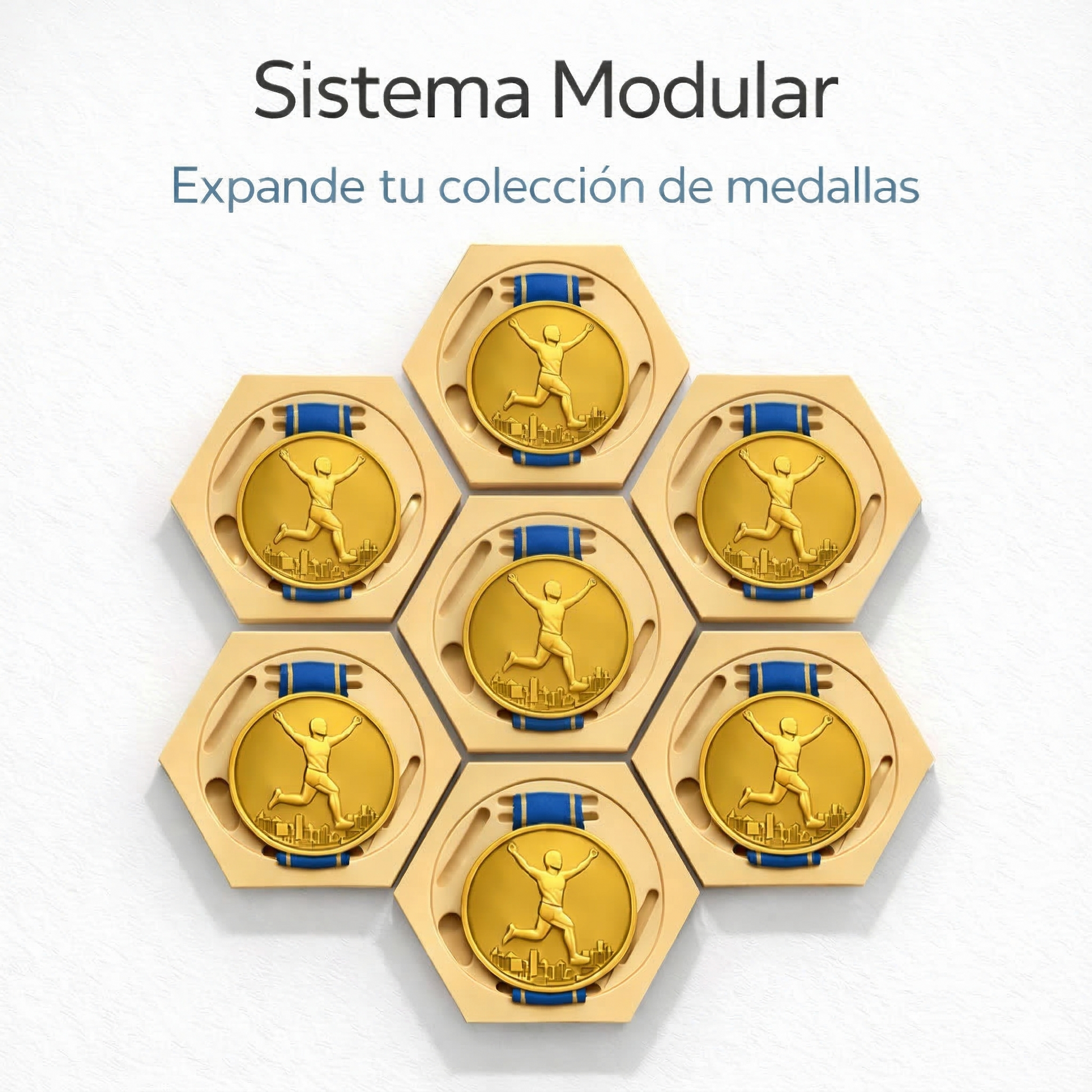 Diseñado especialmente para runners, triatletas y deportistas, este sistema permite crear un muro de medallas modular que crece contigo a medida que conquistas nuevas metas.