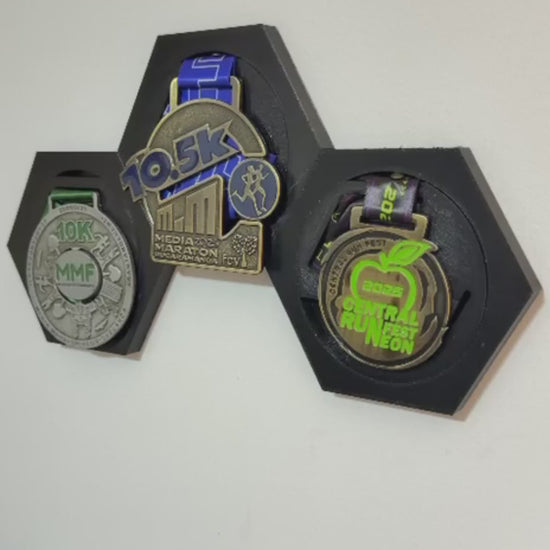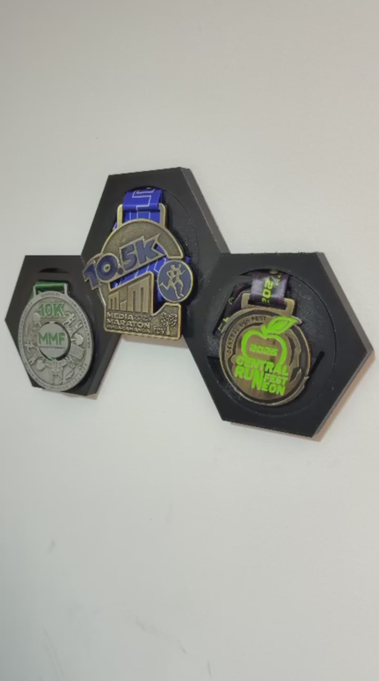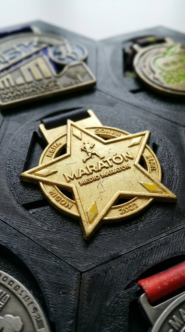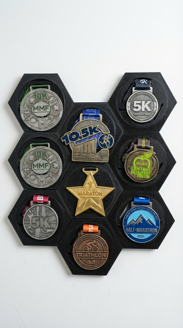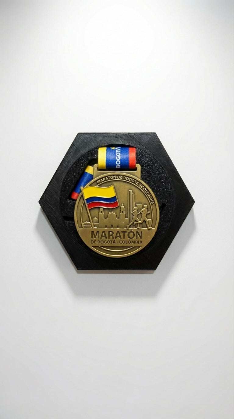 - Diseño Limpio y Minimalista: Su ingenioso sistema interno (ver imágenes) permite enrollar y ocultar la cinta de la medalla dentro del hexágono. El resultado es una exhibición limpia donde la protagonista es únicamente la medalla, sin cintas colgando desordenadamente.